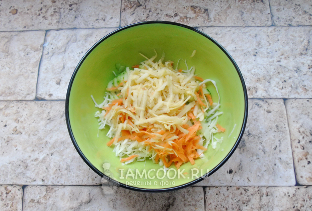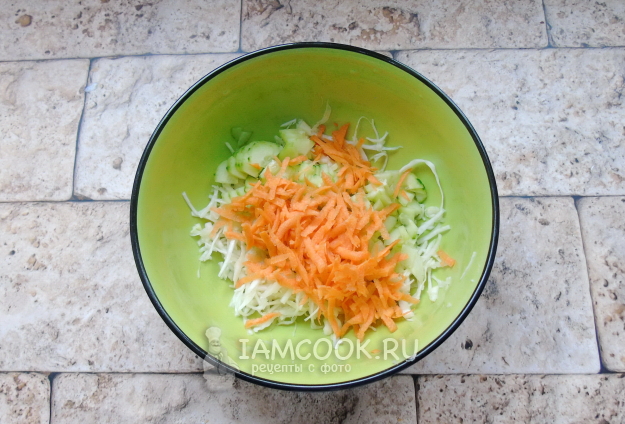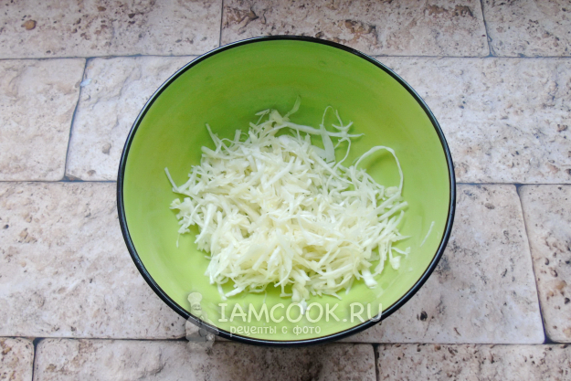 Капусту нарежьте тонкой соломкой, выложите в салатник. Немного посолите и пожмите руками.