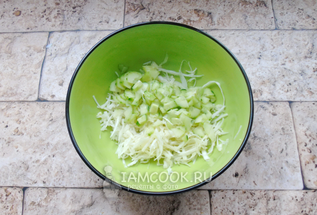 Огурец помойте. Если шкурка толстая, то очистите. Нарежьте мелко и добавьте в салатник.