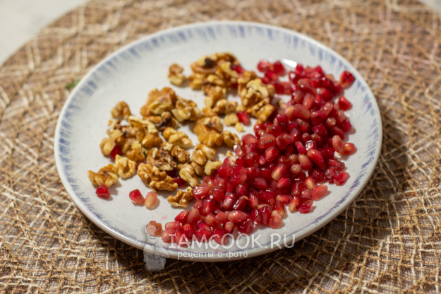 На сухой сковороде подсушите грецкие орехи, а затем поломайте на небольшие кусочки. Очистите гранат и достаньте зерна.