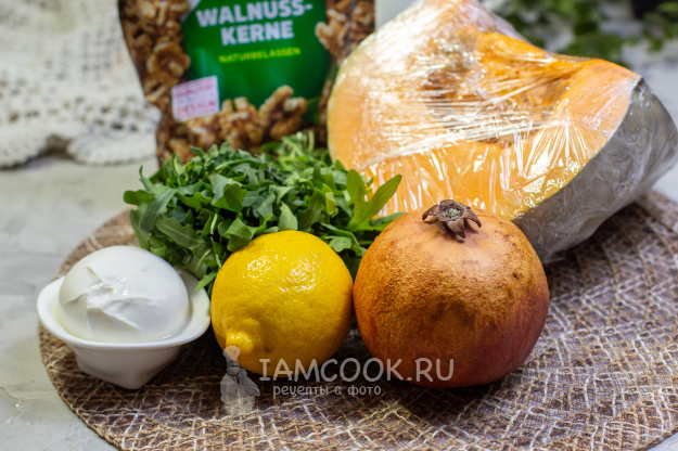 Соберите необходимые продукты для приготовления салата из рукколы и тыквы с орехами и гранатом. Вам понадобится свежая руккола, немного свежей тыквы, зерна граната, грецкие орехи и нежнейшая буррата. В качестве заправки для салата я взяла оливковое масло, лимонный сок и немного меда.