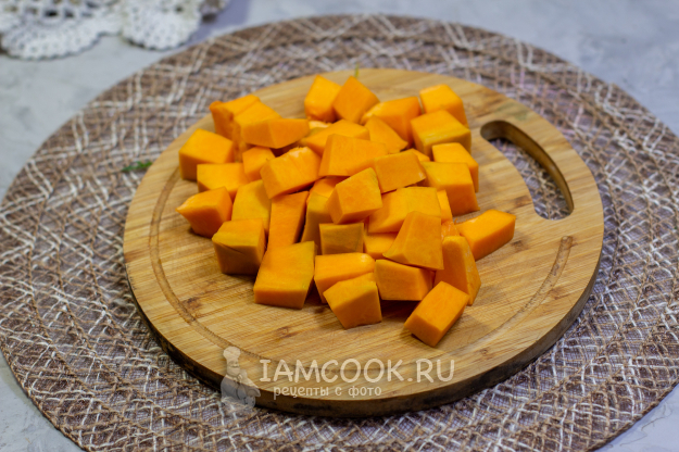 Первым делом приготовим тыкву. Свежую тыкву очистите от кожуры и семечек. Мякоть нарежьте небольшим кубиком.