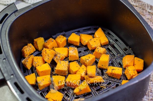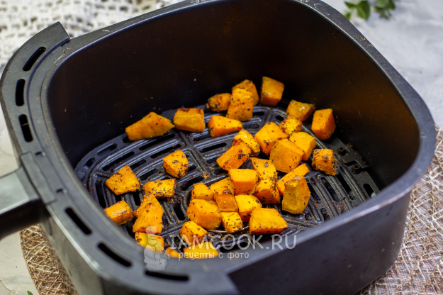 Я буду запекать тыкву в аэрогриле, но можно ее приготовить и в духовке. Кусочки тыквы разложите в емкость аэрогриля и запекайте 15 минут при температуре 180 градусов.