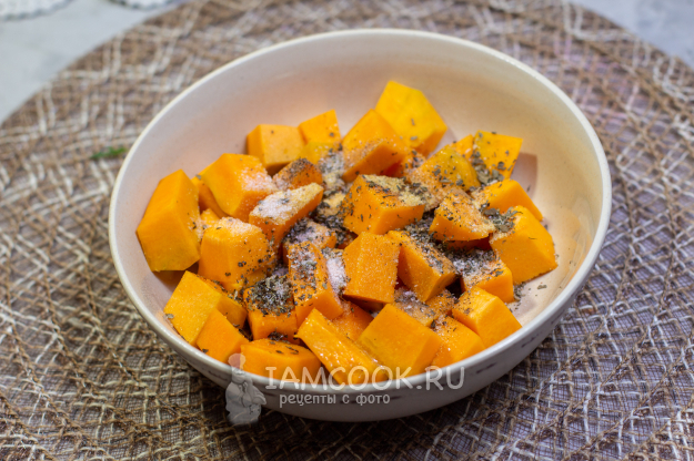 Кусочки тыквы переложите в подходящую посуду, добавьте немного соли, черного молотого перца, сушеного чеснока и сушеного орегано. Перемешайте специи с тыквой.