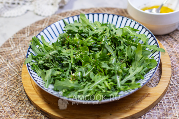 Соберите салат. На блюдо выложите помытую и обсушенную рукколу, полейте половиной приготовленной заправки.