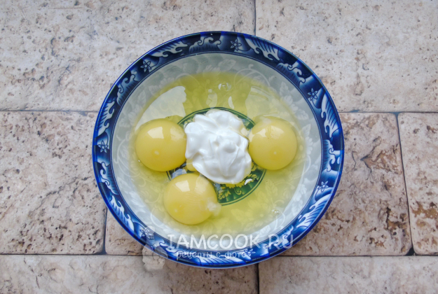 Посолите по вкусу и немного взбейте яйца со сметаной.