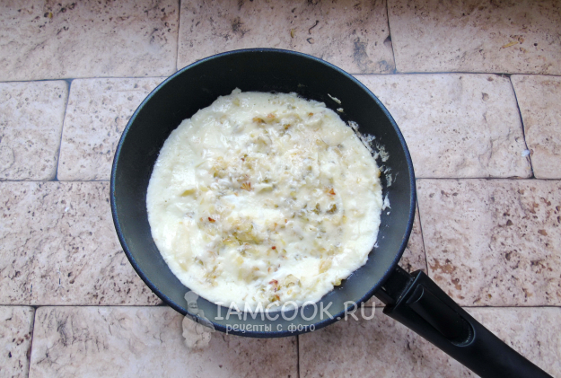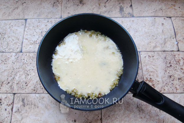 Сковороду с луком и огурцом хорошо разогрейте и влейте смесь из яиц и сметаны.
