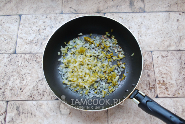 Жарьте до прозрачности. После соленый огурец натрите на терке и добавьте в сковороду с луком.