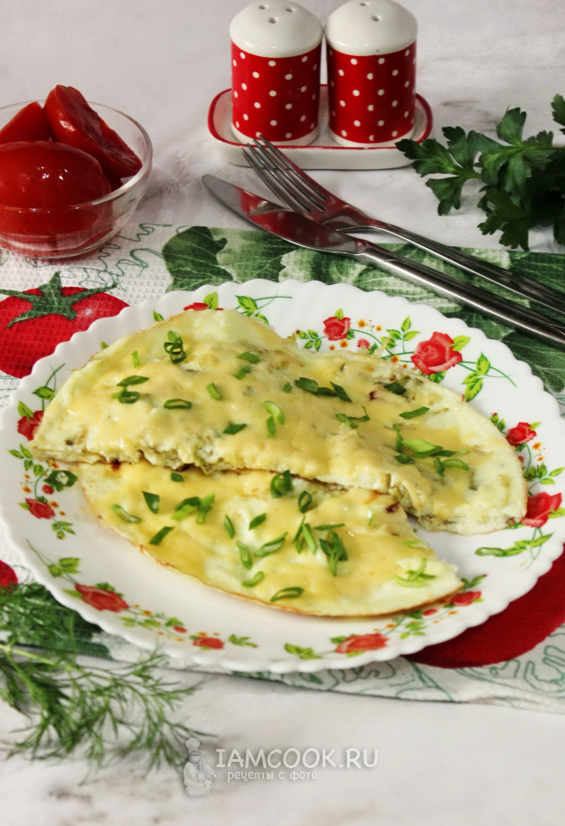 Снова накройте сковороду крышкой и прогревайте 1-2 минуты. Затем плиту выключите и подержите омлет под крышкой еще 3 минуты, пока сыр полностью не расплавится.