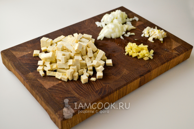 Тофу обсушите на бумажном полотенце, нарежьте мелким кубиком. Репчатый лук, чеснок, имбирь мелко нарежьте.