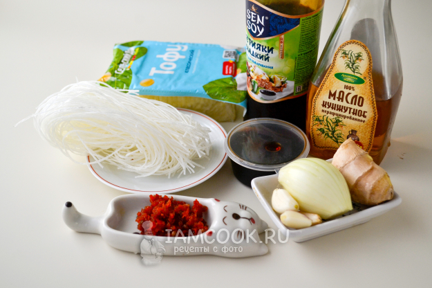 Соберите продукты для приготовления тофу с рисовой лапшой.
