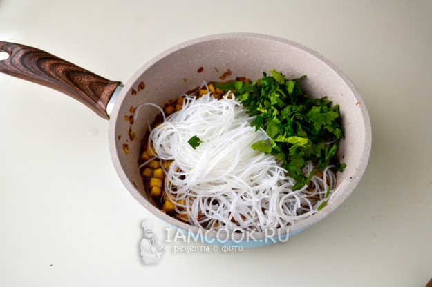 Положите в соус рисовую лапшу. Для удобства лапшу можно нарезать ножницами на более короткие кусочки. Добавьте нарезанную петрушку. На этом шаге можно добавить зеленый лук.