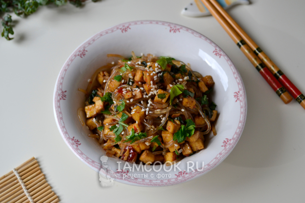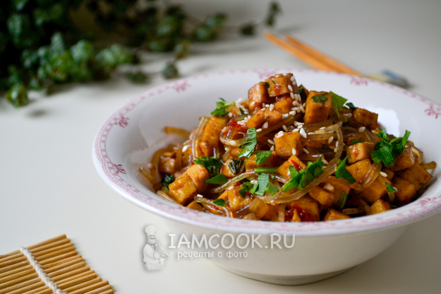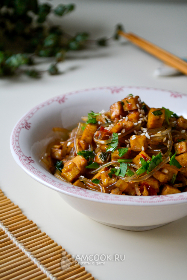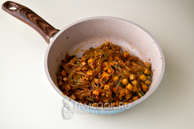 Перемешайте, на умеренном огне тушите 1-2 минуты, помешивая. Большая часть жидкости впитается в лапшу. Тофу с рисовой лапшой готовы.