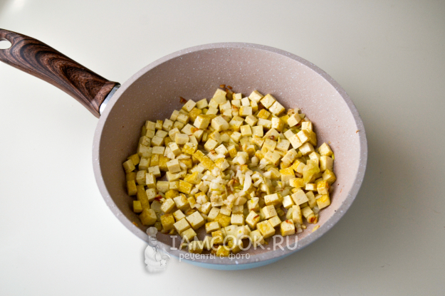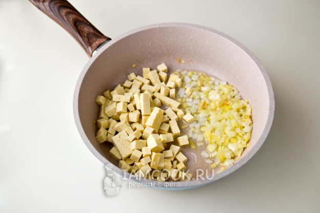 Положите в сковороду кубики тофу в один слой.