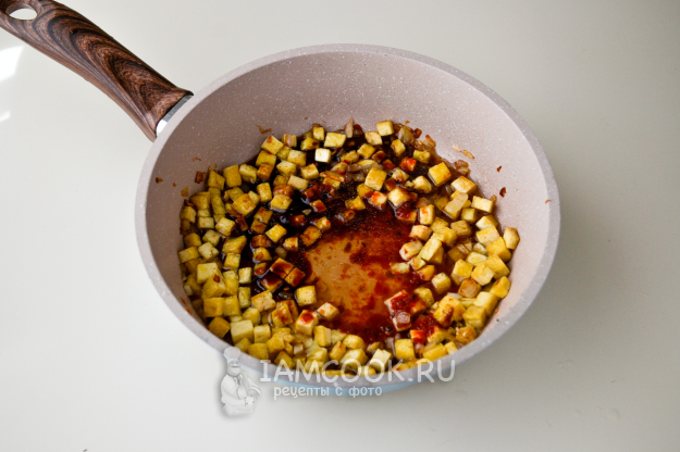 Перемешайте, когда нижняя сторона тофу обжарится до румяности, пропитается вкусом и ароматом лука и имбиря. Добавьте чеснок, перемешайте и обжарьте еще пару минут.
