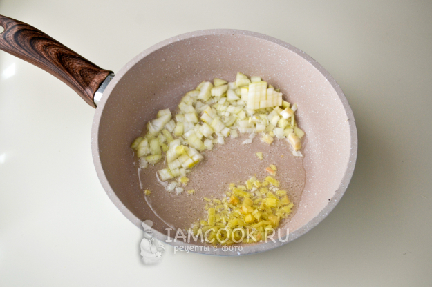 На раскаленную сковороду с растительным маслом положите лук и имбирь. Помешивая, на сильном огне обжарьте лук с имбирем пару минут.