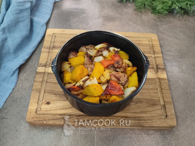 За это время я дважды перемешивала содержимое и 3 раза включала режим пара. Овощи и индейка полностью готовы, тыква мягкая, румяная, мясо сочное и нежное. Времени на приготовление может уйти у вас чуть больше или меньше, в зависимости от размера кусочков и технических характеристик гриля, но всегда можно достать кусочек и попробовать его)). А у меня вот такая румяная индейка с овощами в аэрогриле получилась.