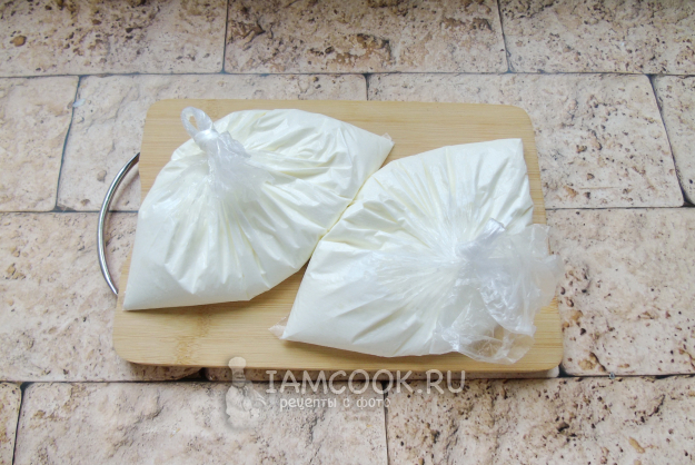 После достаньте пакеты из морозильника и дайте им постоять при комнатной температуре 15-20 минут. Затем освободите кефир со сметаной от пакетов и выложите в дуршлаг с марлей, сложенной в несколько слоев. Дуршлаг поместите в миску, которая выполнит роль поддона. В него будет стекать сыворотка.