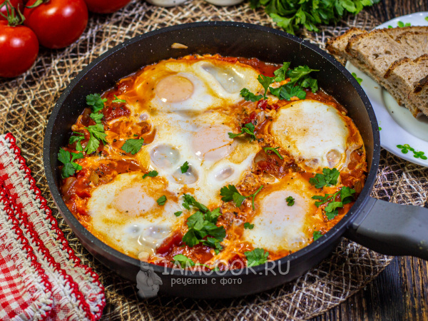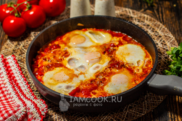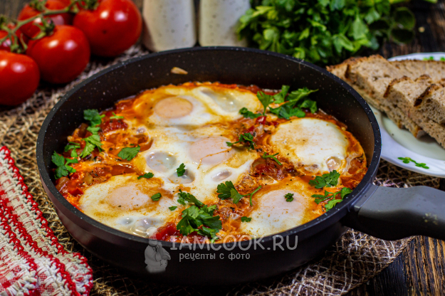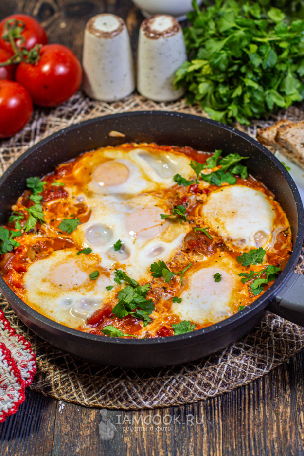 Накройте сковороду крышкой и готовьте ленивую шакшуку до желаемой степени готовности яиц: с жидким или полностью схватившимся желтком.