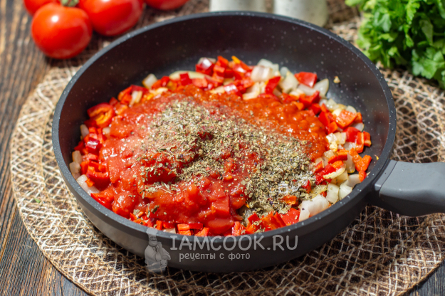 Перемешайте, посолите, добавьте любимые специи и тушите на среднем огне около 5–10 минут, чтобы соус слегка загустел.