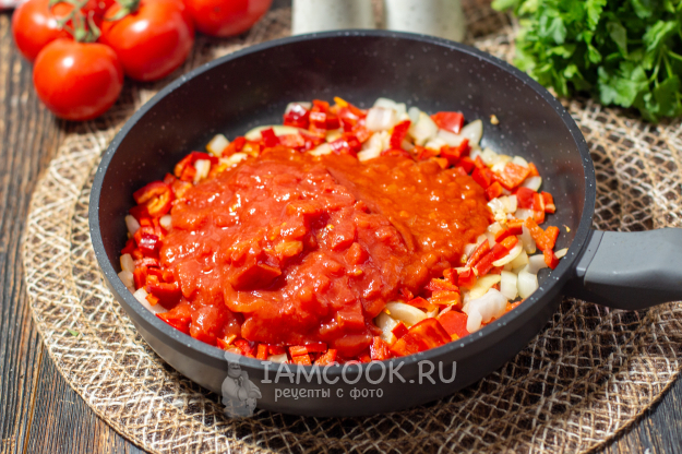 Влейте в сковороду консервированные томаты вместе с соком.
