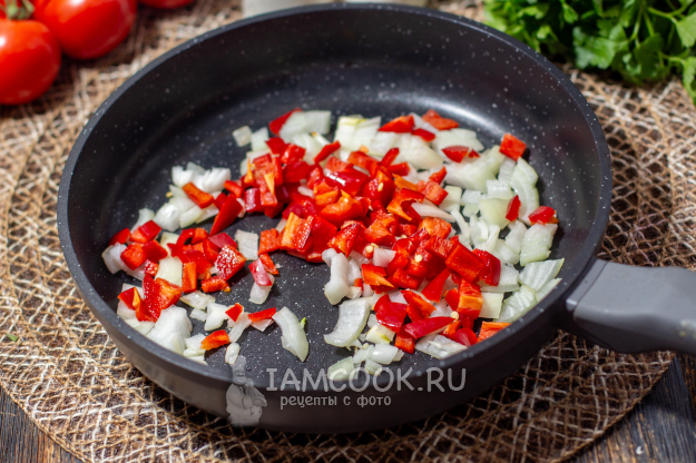 Сладкий перец очистите от семян и нарежьте полосками или кубиками. Добавьте сладкий перец и готовьте вместе с луком ещё 3-4 минуты, пока овощи не станут мягкими.