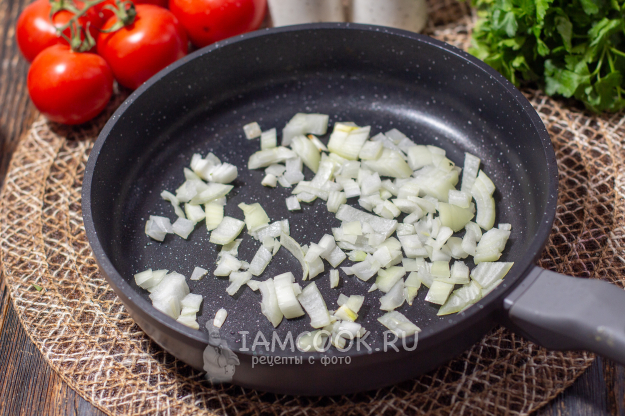 Лук очистите и нарежьте небольшими кубиками. Обжарьте на сковороде с небольшим количеством масла.