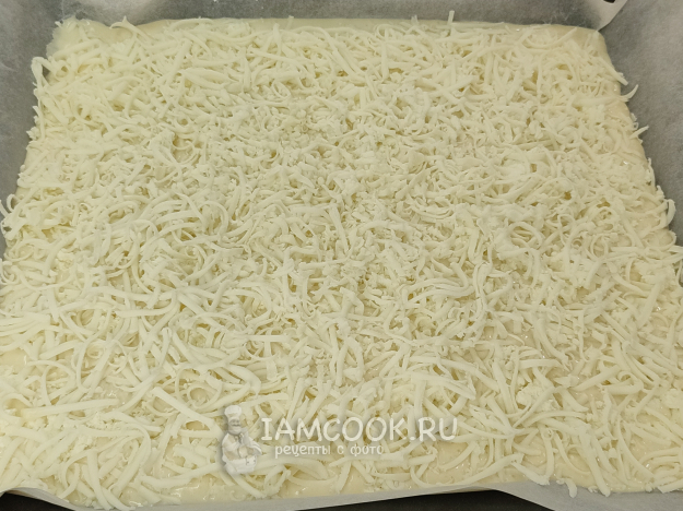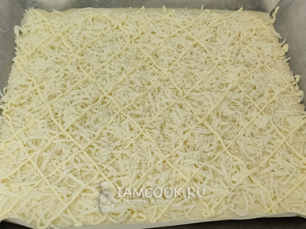 Также сразу прямо на тесто натираю сыр на крупной терке, равномерно над всей поверхностью.