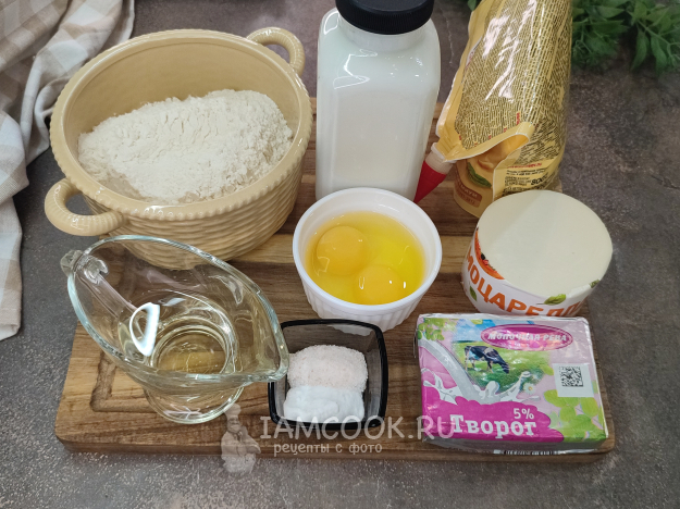 Соберите ингредиенты для приготовления заливного пирога с творогом и сыром (на кефире). Ингредиенты крайне просты и доступны, сыр берите любой, главное, чтобы он хорошо плавился. Духовку можно сразу включать разогреваться до 180 градусов, тесто готовится быстро.