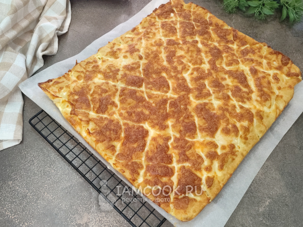 Заливные пироги можно формовать разными способами. Можно начинку вмешать в тесто, вылить в форму, запечь. Можно в форму для запекания вылить половину теста, затем уложить начинку и залить второй половиной теста, запечь. Я сегодня хочу сделать большой пирог, открытый, в самом большом противне. Слой теста будет очень тонким, пирог испечется очень быстро, да и сыр вкуснее, если он румяный, запеченный сверху). Поэтому выливаю все тесто в противень, застеленный пергаментом. Пергамент должен быть высочайшего качества, конечно.