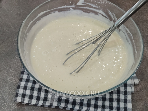 Муку всыпайте частями, постепенно, чтобы "поймать" нужную консистенцию теста. Оно должно получится текучим, в меру густым, похожим на тесто для оладий или на консистенцию нежирной сметаны. В конце добавьте соль, соду, еще раз перемешайте.