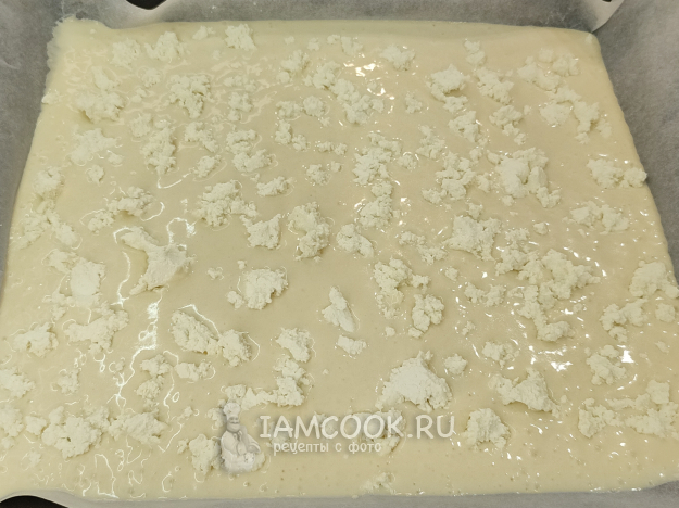 Руками крошу творог прямо на пирог, равномерно распределяя его по всей поверхности.