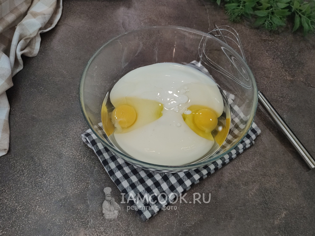 В глубокую миску влейте кефир, яйца, масло, перемешайте.
