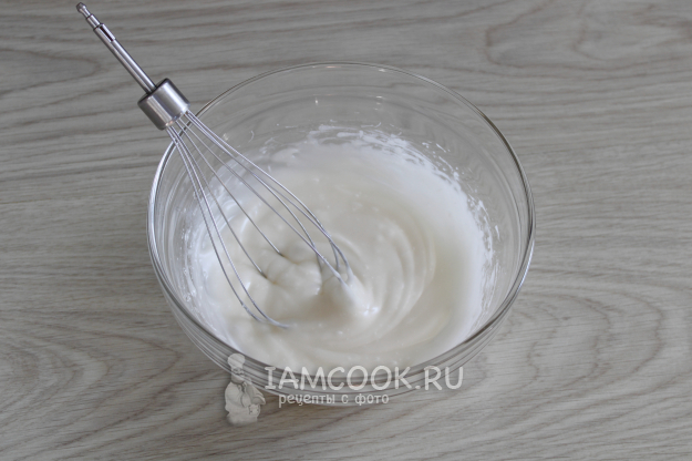 Дайте немного остыть, по ощущениям это горячо, но рука терпит. Можно перелить в другую ёмкость для ускорения остывания. Взбейте до побеления.