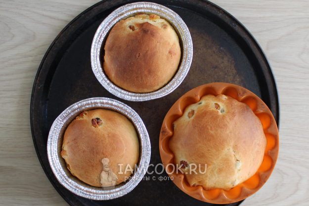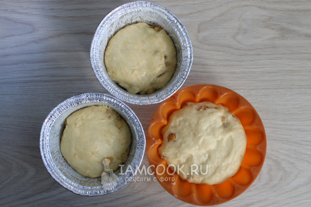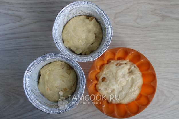 Затем разложите порции теста по формам для куличей.