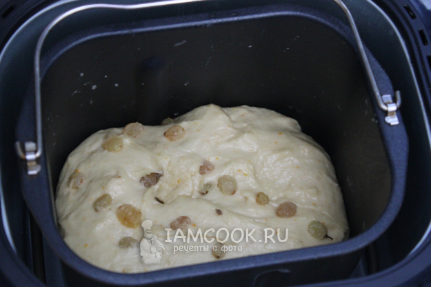 После первого подъема примерно через 40-60 минут вмешайте изюм. Его нужно откинуть в ситечко, а потом ещё можно припудрить мукой.