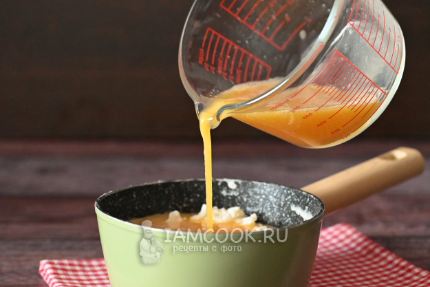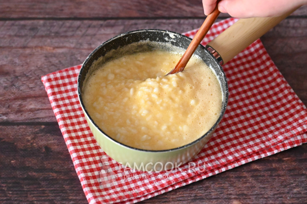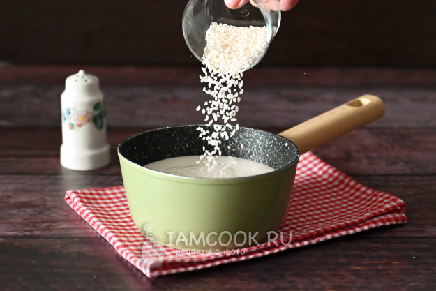В ковш влейте молоко и всыпьте рис. Лучше брать круглозёрный рис, так как он более клейкий и бабка лучше будет держать форму.