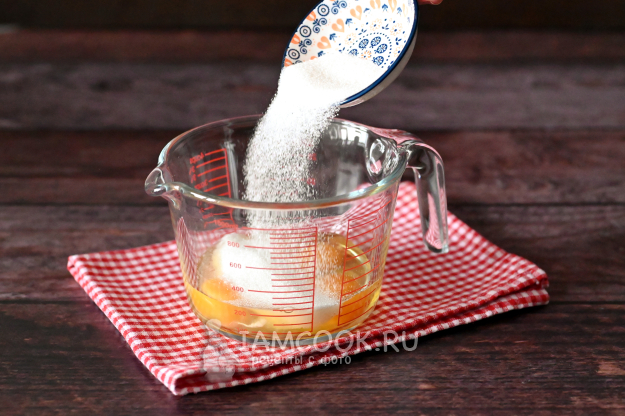 В отдельной миске соедините яйца и сахар. Количество сахара можно увеличивать или уменьшать по вкусу.