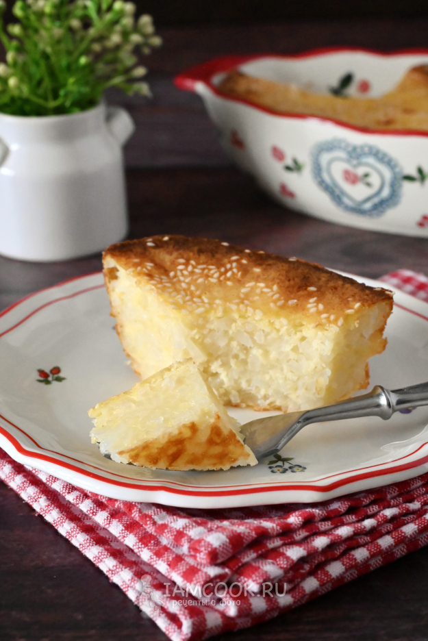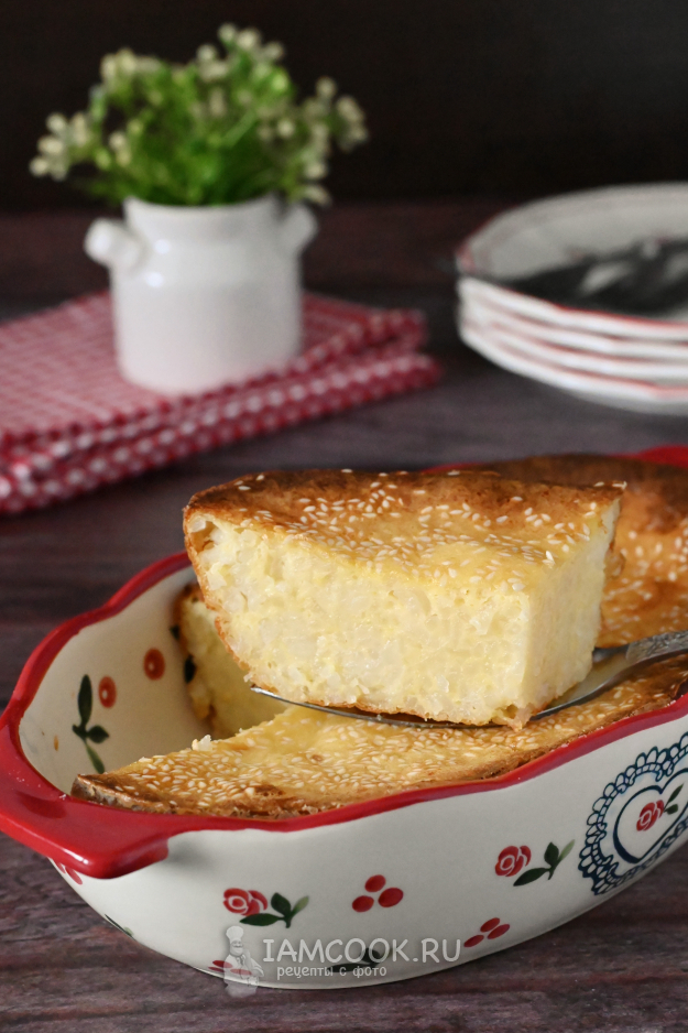 Готовую рисовую бабку достаньте из духовки, дайте ей отдохнуть примерно 10 минут (она за это время чуть осядет). Затем можно нарезать бабку на порции и подавать к столу.