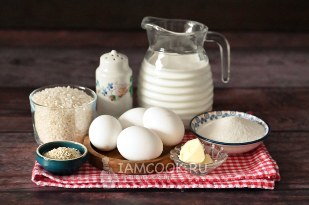 Соберите необходимые продукты для приготовления рисовой бабки на молоке.
