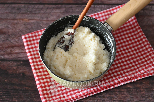 Доведите до кипения и варите рис в молоке на небольшом огне примерно 15-20 минут, до состояния вязкой каши. Периодически помешивайте, чтобы не подгорело.