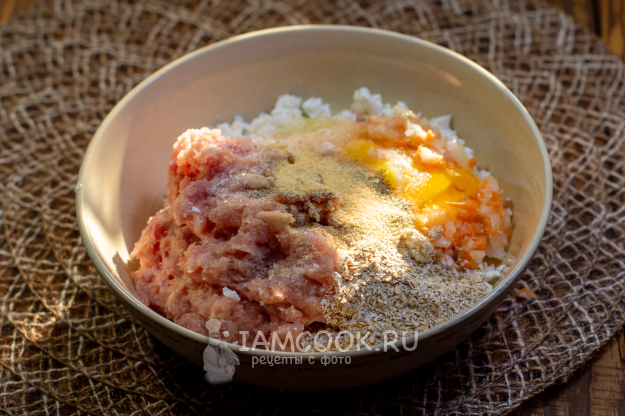 В глубокой миске соедините куриный фарш и творог. Добавьте яйцо и отруби.