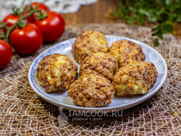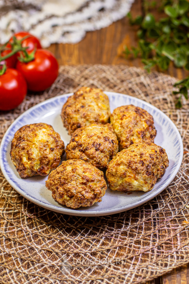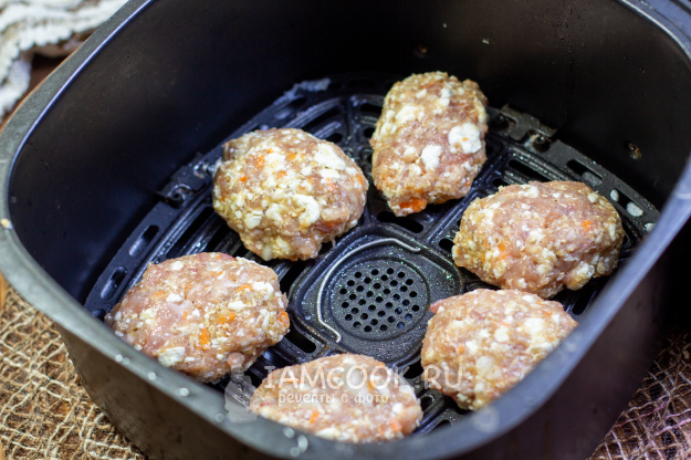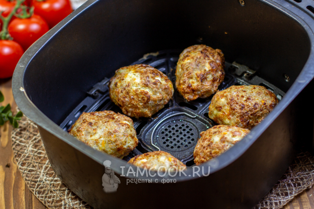 Сформируйте небольшие котлеты руками, придавая им аккуратную овальную или круглую форму. Выложите котлеты в корзину аэрогриля, при необходимости застелив её пергаментом (я не застилаю). Готовьте куриные котлеты с творогом в аэрогриле при температуре 180°C примерно 15–20 минут, до золотистой корочки. При желании можно перевернуть котлеты на середине приготовления.