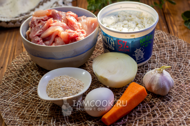 Соберите необходимые продукты для приготовления куриных котлет с творогом в аэрогриле. Можете взять готовый куриный фарш или приготовить его самостоятельно из куриного филе или бедер без костей и кожи. Мне нравится готовить из куриных бедер, так они получаются более сочными. Творог нужен вкусный, не кислый и без лишней сыворотки. Чтобы котлеты хорошо держали форму, в качестве связующего ингредиента я добавила овсяные отруби, которые можно заменить на муку или овсяные хлопья.
