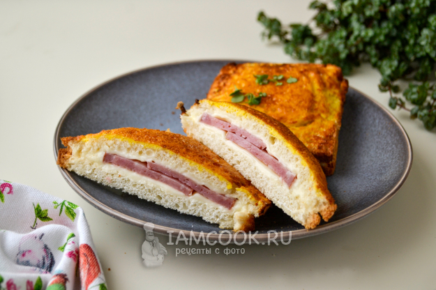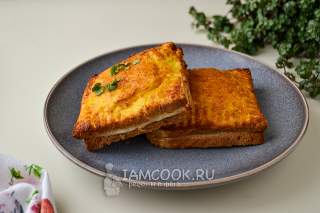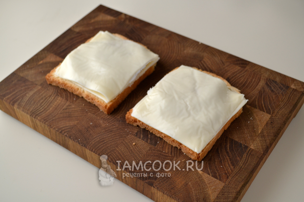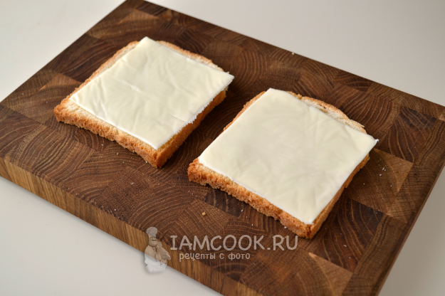 Яйцо разбейте в мисочку, чуть посолите и взболтайте до однородности. Смажьте верхний тостовый хлеб взболтанным яйцом. Смазывать удобно силиконовой кисточкой.