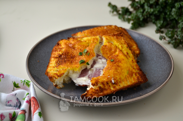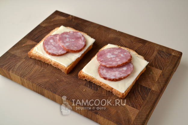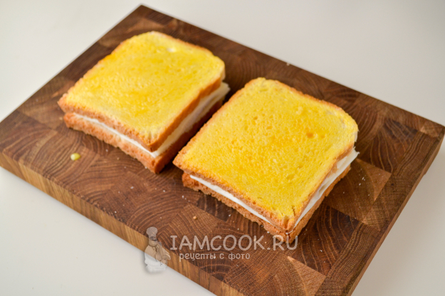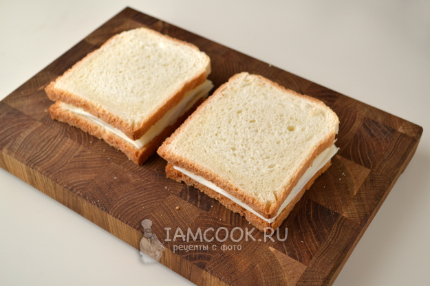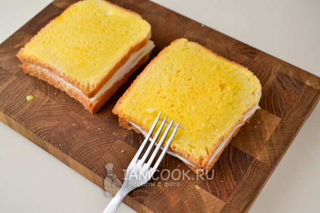 Вилкой слегка прижмите верхний хлеб по краю, как бы запечатывая начинку внутри будущего "Кармашка".