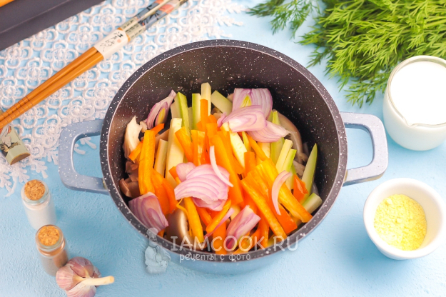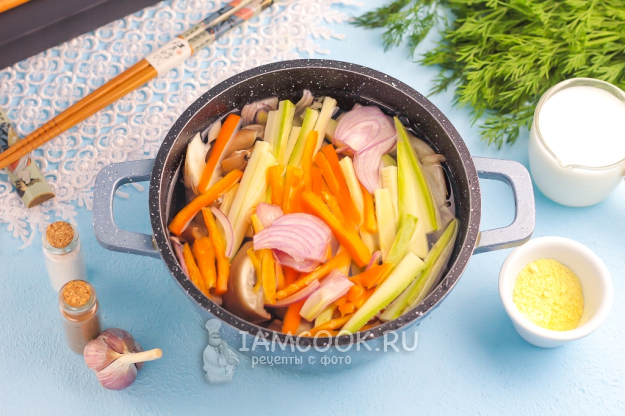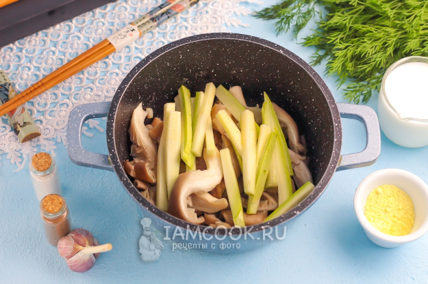 Вешенки срежьте с основания и промойте в воде вместе с кабачком. Нарежьте ломтиками грибы и длинными лентами либо брусочками половину кабачка, выложите в сотейник, казан.