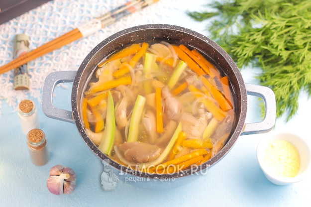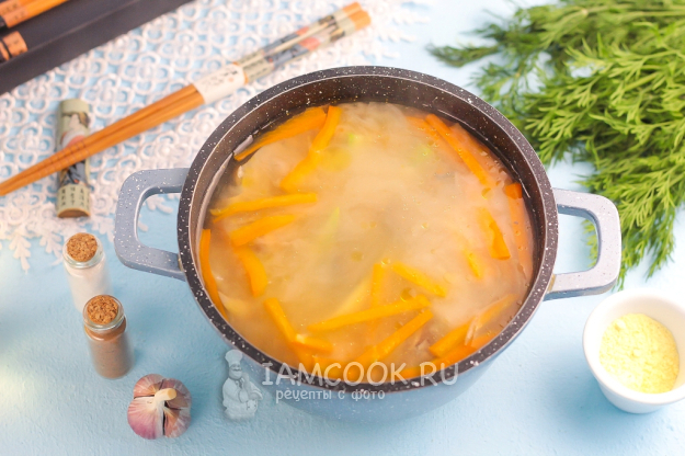 Выложите лапшу в бульон. По желанию ее можно разломить на несколько частей.