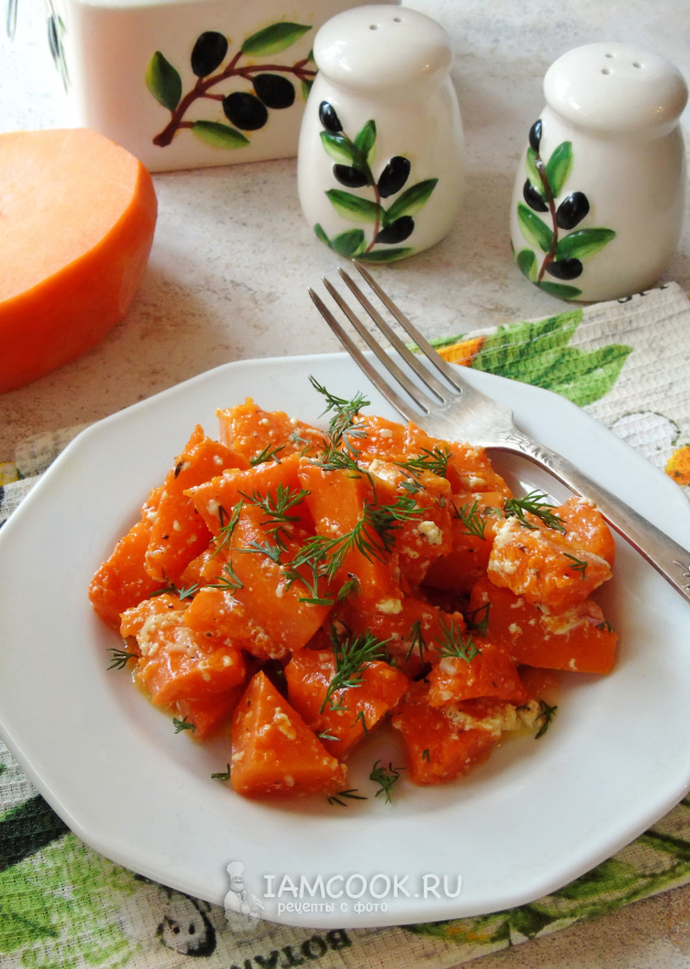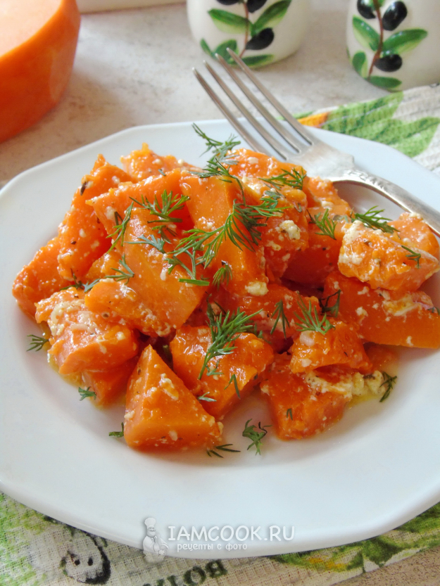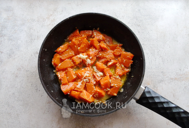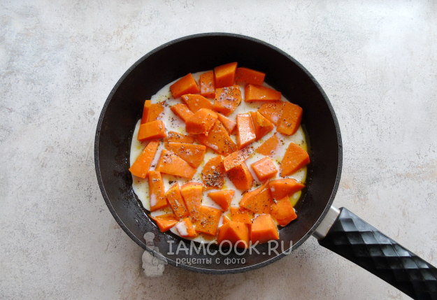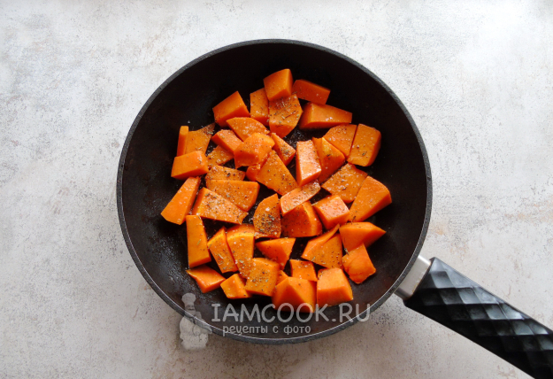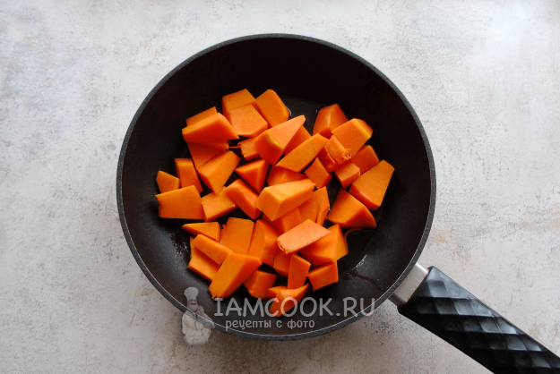 Тыкву очистите, помойте и нарежьте кусочками. Выложите на сковороду.