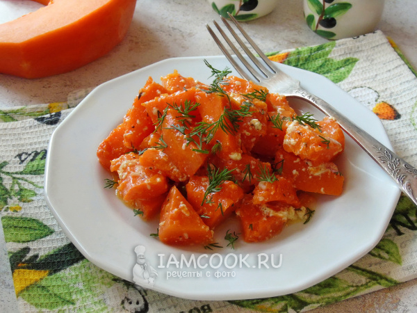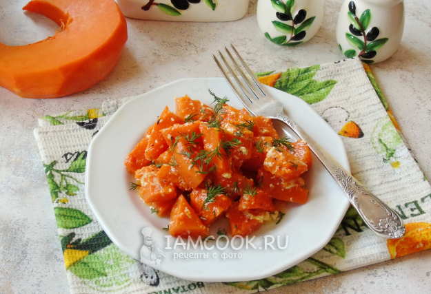 Тыква с молоком на сковороде готова. Выложите её на тарелку, посыпьте укропом и подавайте к столу.