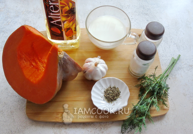 Соберите ингредиенты для приготовления тыквы с молоком на сковороде.
